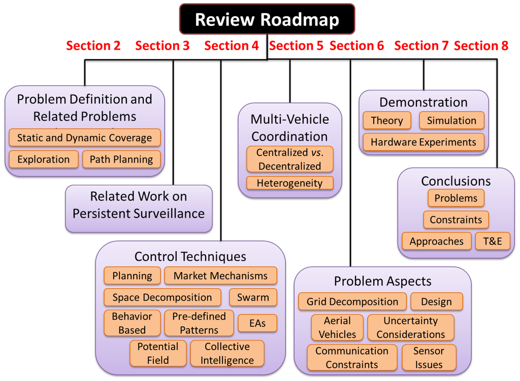 Figure 1 shows the roadmap for this paper. We begin with a discussion of the problem definition and other problems that are related to persistent surveillance, in Section 2. We then look at papers that have looked specifically at variants of this problem in Section 3. Section 4 provides a rough categorization of approaches for single and multi-vehicle control, citing particular work in each of those categories. Note that these categories are not mutually exclusive, and certain work lies in more than one of them. Section 5 briefly discusses ideas for multi-agent coordination used for this problem, along with centralized vs. decentralized techniques and studies with heterogeneous platforms. In Section 6 we looks at certain aspects/extensions of the problem, including grid decompositions, communication architectures, sensor issues, and concerns for aerial vehicles. The section ends with a brief discussion of approaches to deal with uncertainties and a novel aspect coupling control system and vehicle design problems. This provides a quick access to the relevant work associated with particular aspects of interest, while emphasizing on the amount of work done in each domain. The methods proposed in existing literature have used different approaches for verification, ranging from theoretical proofs of soundness and completeness, to hardware demonstrations. These are identified in Section 7 and finally we end with a dicussion of future directions of research in Section 8.