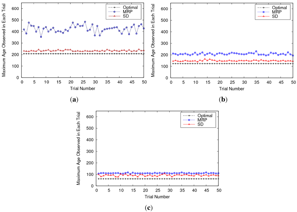Maximum age observed in each trial over all cells (over entire simulation period). The plots give an idea of the variance in performance using MRP and SD as well. (a) Comparisons for 3 UAVs; (b) Comparisons for 5 UAVs; (c) Comparisons for 10 UAVs.