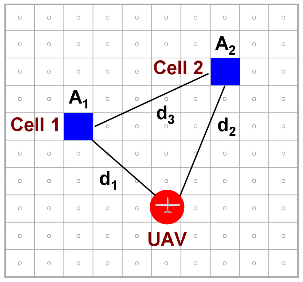 Illustration showing the target space gridded using cells. Each UAV has a circular sensor footprint that equals the grid cell size.