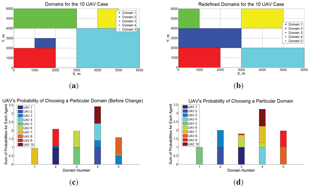 The authors of this paper applied PC for space decomposition, replacing the GA discussed earlier [55] with a decentralized implementation of PC. Figure 14 shows an example of comparison between PCGA and PC for a 36 UAV case. The results show that PC works better than PCGA—the remarkable improvement in efficiency for larger design spaces is a result of using decentralized optimization in PC, which does not exponentially increase in cost with the number of dimensions. Though the results are not conclusive, they are certainly promising from the point of view of PC application. The use of probability distributions also provides an ability to react to uncertainties in environment and “learn” appropriate control policies in dynamic environments. This particular problem has become an interesting avenue of research, especially in the game theoretic learning community [159,160,161,162]. We have also applied PC to a dynamic replanning problem for a persistent surveillance mission—a complete discussion of this application can be found in [136]. Here, we present a snapshot of the results to show the applicability of PC. Figure 15 shows the domains (to which UAVs are assigned for persistent surveillance) and the associated probabilities of UAVs to be assigned to each domain. We observe that the sum of probabilities of UAVs being assigned to a domain are roughly proportional to the domain size and these probabilities are able to adapt to changes in domain sizes.