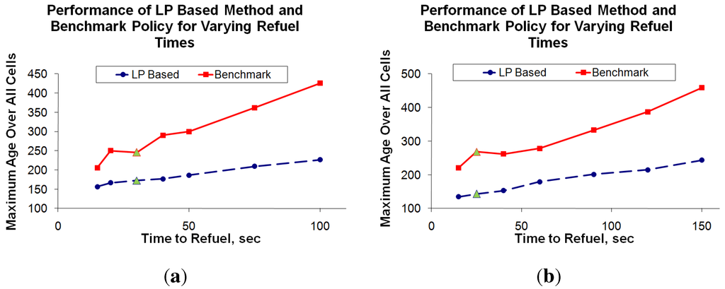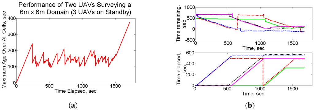 An inevitable part of persistent surveillance is the ability to support persistent operations in real life—in presence of uncertainties and failures. Another way to look at this problem is, as the case where the task timeline is longer than the lifetime of vehicle [93]. Valenti et al. [108,109] claim that the most important problem in persistent operations is coordination of resources, and advocate the use of a health monitoring system for this purpose. They demonstrate a mission health management system for 24/7 persistent surveillance trying to keep at least one UAV airborne in a target area. The authors of this survey have looked at the other aspect—maintainance of good mission performance in such a scenario [110]. Bethke, Bertuccelli, and How [111] also focus on improving efficiency by finding the optimum health monitoring policy (deciding when the UAVs should land and takeoff) online. Kim, Song, and Morrison [112] have also focused on the refueling issue for border patrol and tracking, but presented results only in simulation. Similar work can be found in [113], where the objective is to continuously survey a target space and closely track objects of interest. However, this is a relatively unexplored area of research and has been gaining importance only recently.