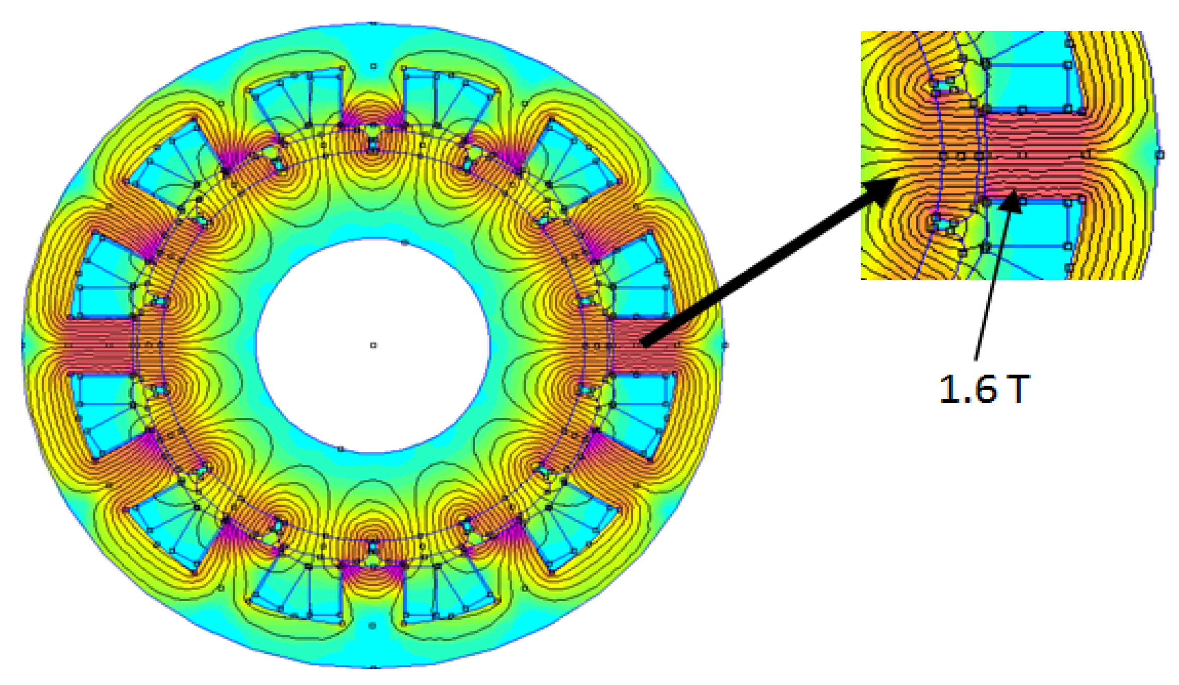 The magnetic flux distribution in a concentrated winding structure with 14 poles and 12 slots. At no-load case, the highest level of magnetic induction is in the teeth.