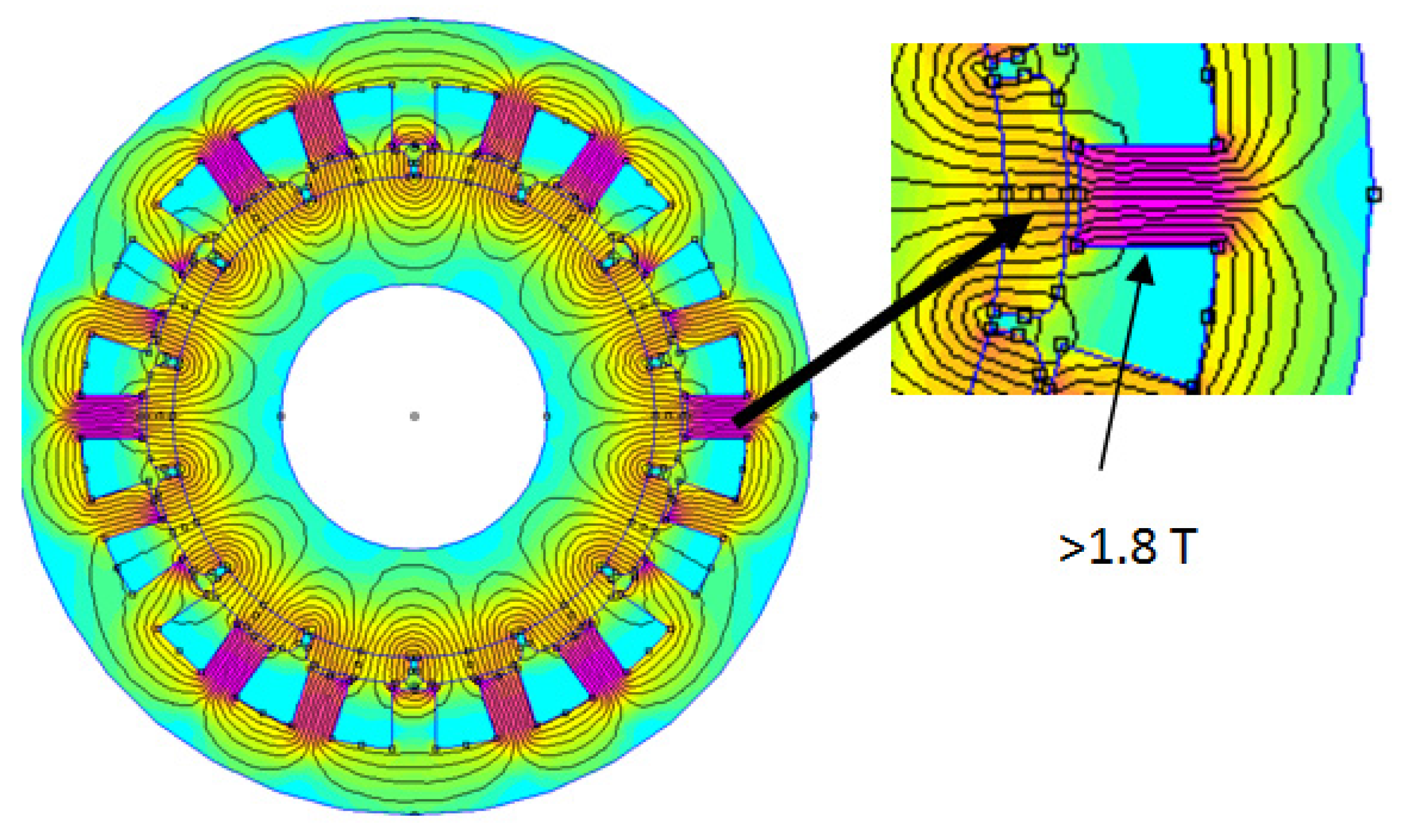 3]. In this reference, the authors have designed two machines with the same power (80 kW) and the same speed (300 rpm). The first one uses FSCW and the second one uses a distributed winding. As the thicknesses of the cores are very similar, even if the copper volume of the distributed windings is twice the copper volume of FSCW, the efficiency of the machine having concentrated windings is less than the efficiency of the machine having distributed windings. Thereafter, looking at the power factor, it appears that the power factor concerning the distributed windings is 0.86, which is better than the power factor associated to the concentrated windings machine, which is only 0.78. The design of the stator iron core is important and designers must also pay attention at the magnetic flux in the teeth. The reason can be found in observing a simulation of the magnetic flux distribution in the tooth. An effect appears: the tooth acts as a magnetic short circuit for the magnets during their rotation (