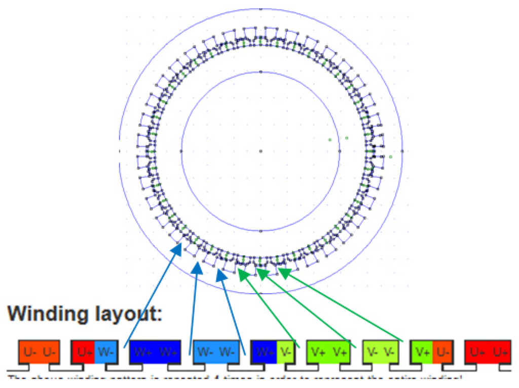 The selection of winding configurations that have a good winding factor is not enough to declare these structures “ready for use”. A drawback is presented thereafter: undesirable circulating currents can appear. With the following example the problem will be highlighted. A machine having 36 slots and 40 poles is examined. The number of slots is below the number of poles and the coils associated to the same phase are adjacent three-by-three (Figure 4). Anyone can verify this solution by using the website at Reference [].