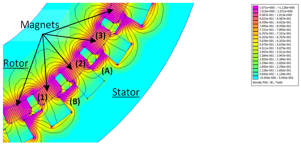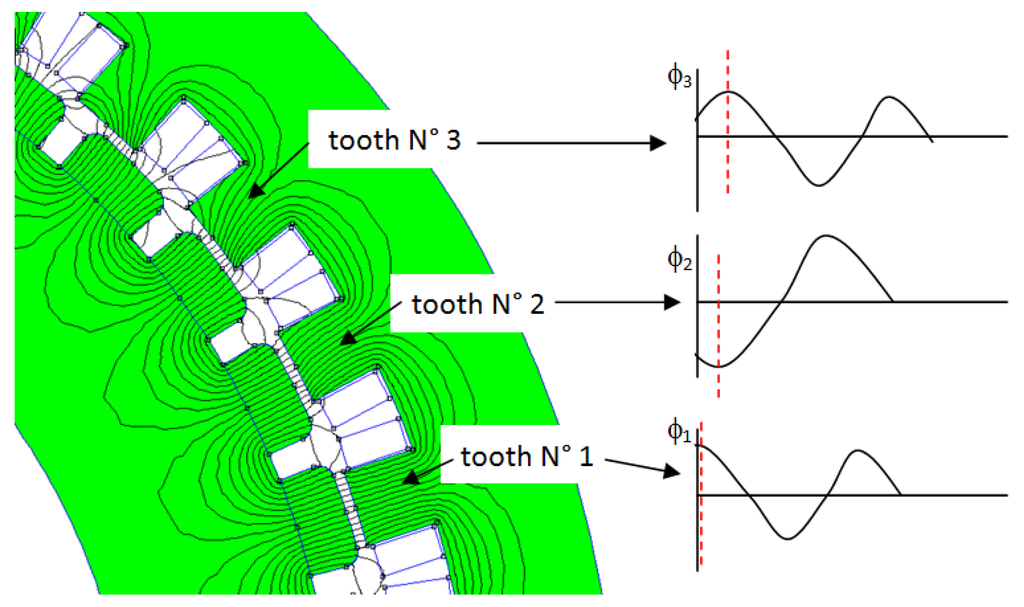 The design engineer knows that flux circulation in a two-pole machine uses the whole part of the stator back-iron to close the magnetic loop. With a low thickness in the back-iron core, the performances of the motor would not be acceptable. The two-pole machines have great power factor (greater than 0.9), but it cannot be sustained if the thickness of the iron core decreases. A 30% decrease in thickness is enough to get a power factor similar to an 8 pole machine. Hence, even if motors using FSCW are generally high-polarity machines, their iron core stator should not be designed with the same traditional scheme. It is a reason why, when comparisons are done, the machines using FSCW are afflicted by the worst efficiency, they have more losses, and iron losses are higher []. In this reference, the authors have designed two machines with the same power (80 kW) and the same speed (300 rpm). The first one uses FSCW and the second one uses a distributed winding. As the thicknesses of the cores are very similar, even if the copper volume of the distributed windings is twice the copper volume of FSCW, the efficiency of the machine having concentrated windings is less than the efficiency of the machine having distributed windings. Thereafter, looking at the power factor, it appears that the power factor concerning the distributed windings is 0.86, which is better than the power factor associated to the concentrated windings machine, which is only 0.78. The design of the stator iron core is important and designers must also pay attention at the magnetic flux in the teeth. The reason can be found in observing a simulation of the magnetic flux distribution in the tooth. An effect appears: the tooth acts as a magnetic short circuit for the magnets during their rotation (Figure 14). This leakage flux, similar to zigzag leakage flux, has a second effect when the slots are open; the magnetic flux in the tooth has a rotational behavior.