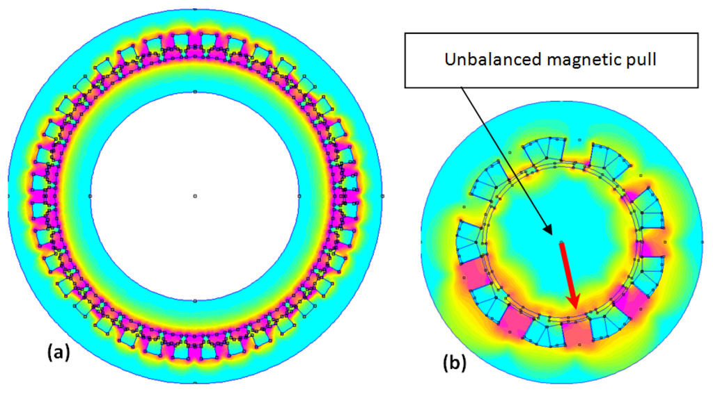 On (a), the distribution of magnetic flux in a 36 slots 40 poles structure at no load. There is no unbalanced magnetic pull; On (b), the distribution of magnetic induction in a 9 slots 10 poles structure at no load. There is an unbalanced magnetic pull as there is no symmetry in the distribution.