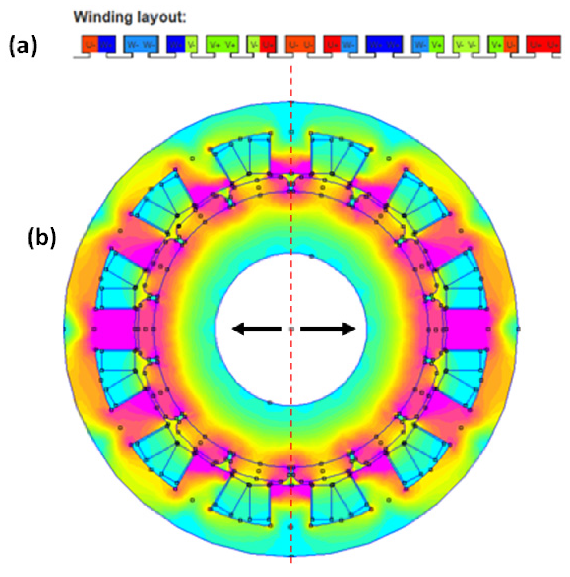 In (a), the winding layout of a 12 slots 14 poles structure is presented; in (b), the magnetic flux distribution is shown. Due to the symmetry, there is a no unbalanced magnetic pull, but a possibility of circulating currents when winding layout is observed.