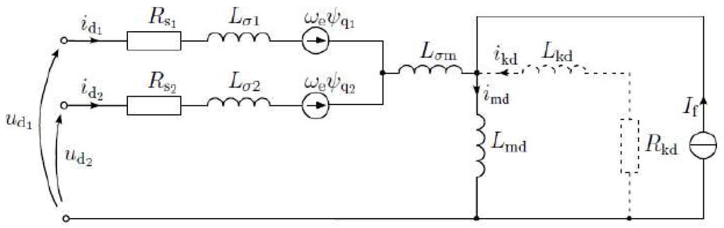 When a d-q model of a double-star winding is observed, it appears that stars are not magnetically decoupled. In Figure 11, the most important parameters are: Lσm and Lσ1 or Lσ2 as it will be shown here after.