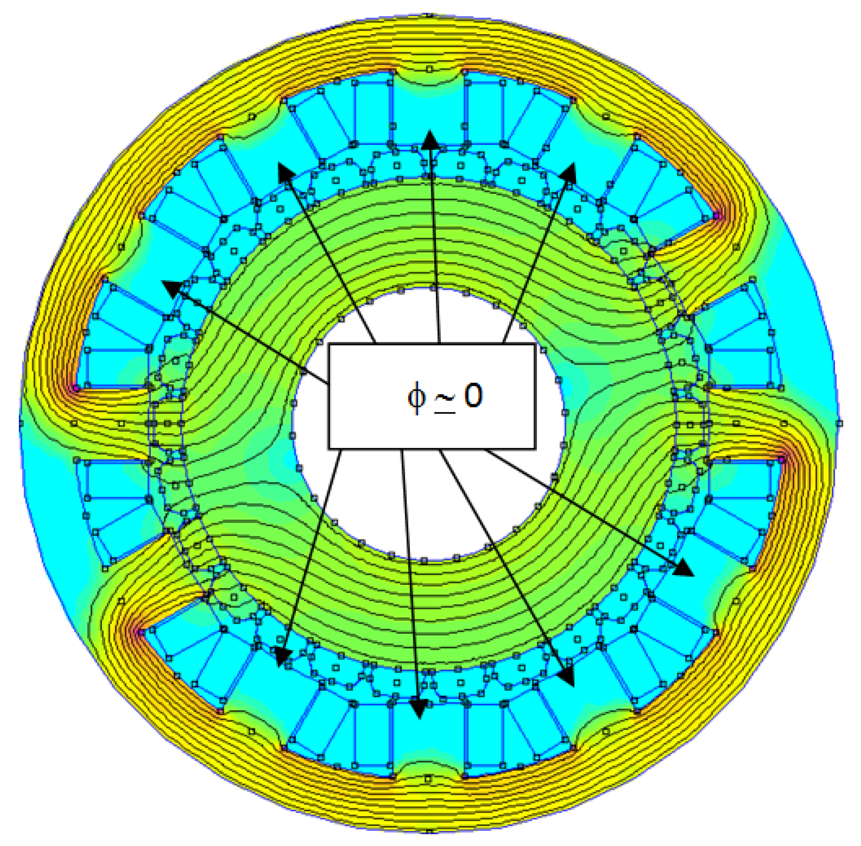 Structures of the active part of a 26 pole 12 slot generator that uses FSCW. With four coils powered and no MMF in magnet, the flux uses a large area of the stator back iron as main path to close the magnetic loop.