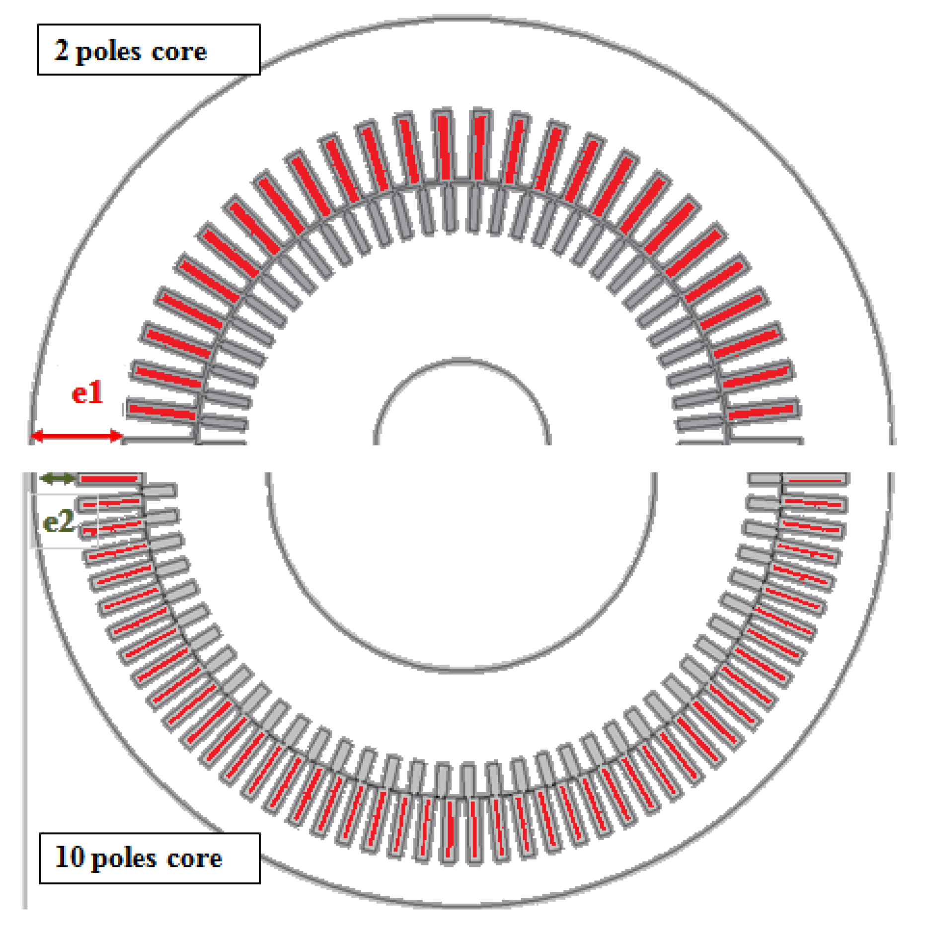 Schemes of the active part of a 2 pole motor compared to the active parts of a 10 pole motor. e1 and e2 are the back-iron core thicknesses (e1 >> e2) and both of them use distributed windings.
