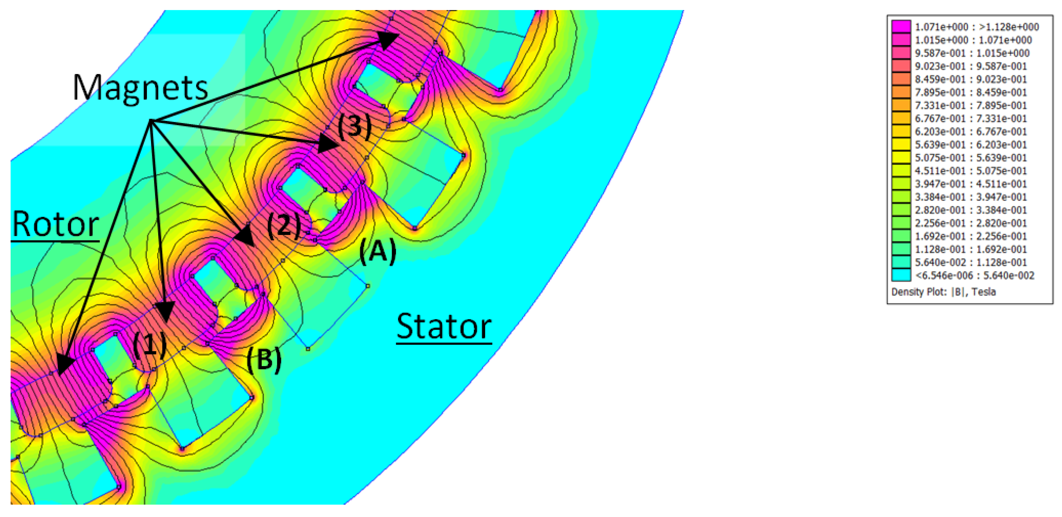 48]. It can be more important with FSCW. When the intensity of magnetic flux is calculated through the surface of a magnet during the rotation of the rotor, a variation appears. In the