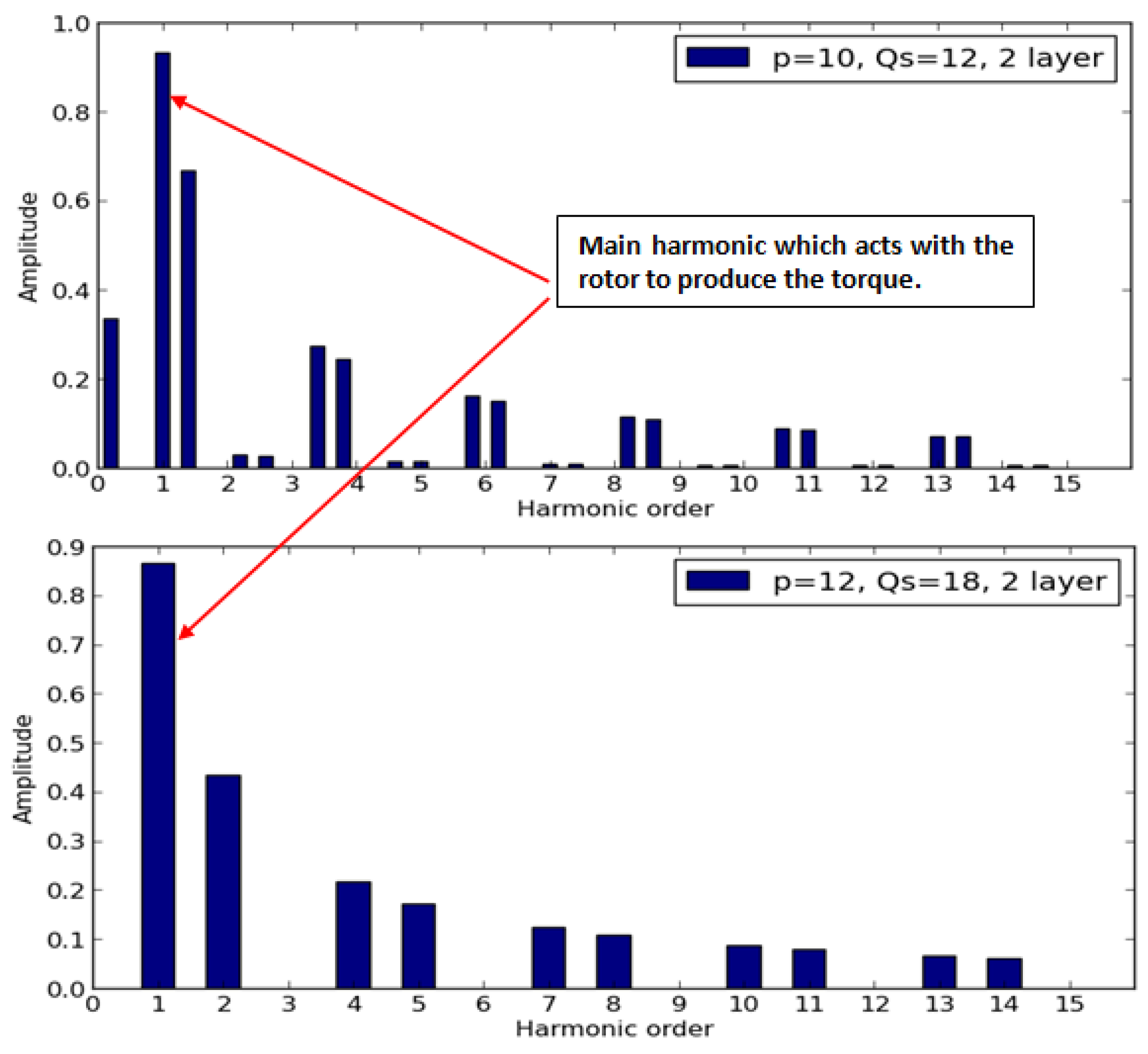 Amplitude of MMF in the air-gap as a function of harmonic rank. Even if the 12-pole/18-slot configuration has fewer harmonics, amplitude of its main harmonic is lower than the amplitude of the main harmonic of the 10-pole/12-slot configuration.