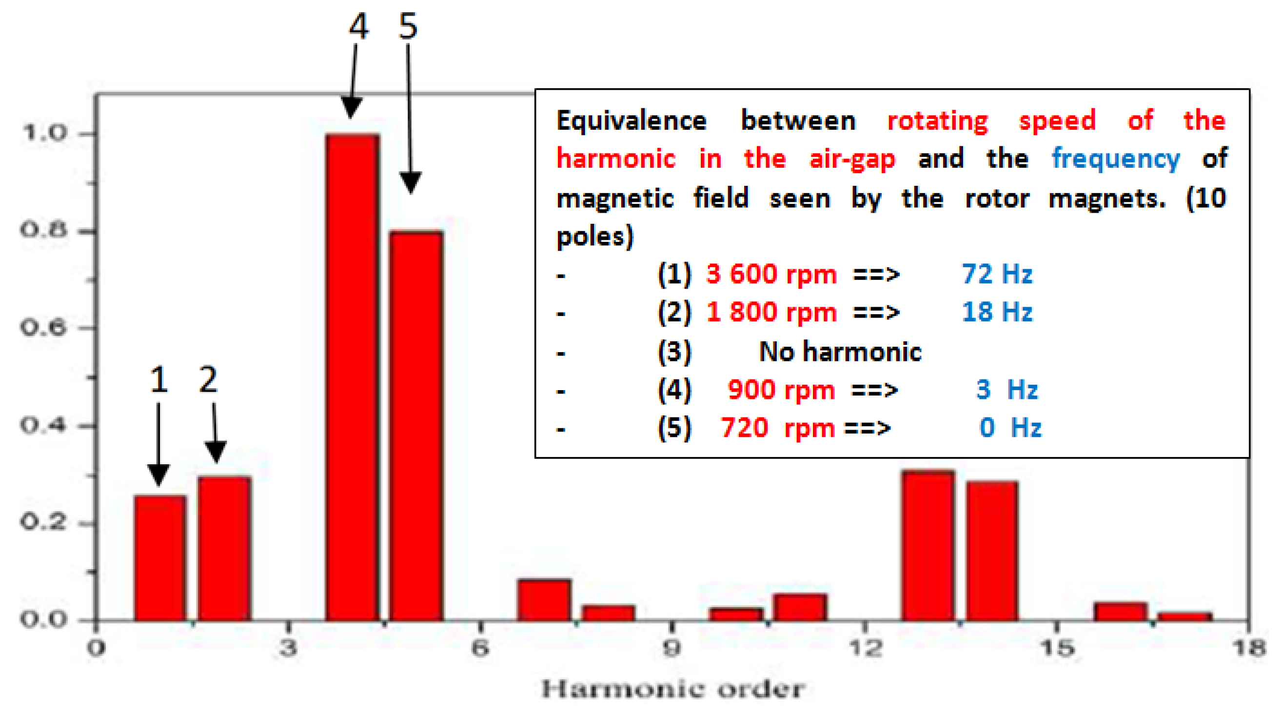 Figure 16, the spectrum of MMF in the air-gap is represented. The main harmonics are used to provide an 8-pole or a 10-pole machine. If this machine is supplied by a 60 Hz power line, the rotor can rotate at 900 rpm (8-pole) or 720 rpm (10-pole). The first harmonic rotates at 3600 rpm and the second at 1800 rpm. Hence, for a 10-pole motor, the first harmonic is seen, by the rotor, as a rotating field running at 4320 rpm. For an observer which is link to the rotor, such a magnetic field is seen as a variable magnetic field which frequency is 72 Hz. The high order harmonics, greater than eight, are seen as magnetic fields with low rotating speeds and also having low amplitudes. The main goal is in the reduction of the harmonic amplitudes below the main harmonic, as they involve high losses in the magnets supported by the rotor. A harmonic which is close to the main harmonic can be an issue for the magnet losses. Its amplitude is high and it cannot be suppressed; its presence is a specificity of the FSCW.