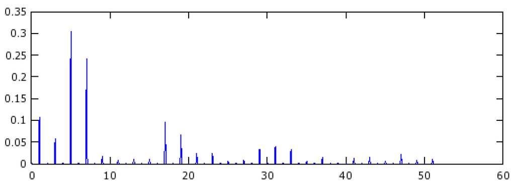 Using simulations, it appears that MMF harmonics, especially the low-order harmonics can be mitigated by using a double-star winding structure. To demonstrate this property, the machine having 14 poles and 12 slots is supplied by two different methods. In the first one, the two stars (Figure 10) are fed by two three-phase power supplies which are synchronous. With these power supplies, the FFT of the MMF in the air gap is presented in Figure 17. As it is expected, the harmonics five and seven are the most important harmonics as they provide a machine with 10 poles and a machine with 14 poles, the harmonics one and three are not negligible.