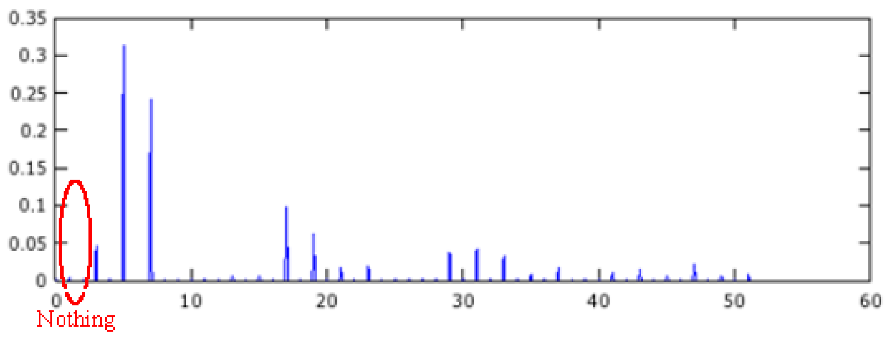 The amplitudes of harmonics of the MMF in the air-gap. The 12-slot structure is fed by two three-phase supplies shift electrically by 30°. The first harmonic has vanished.