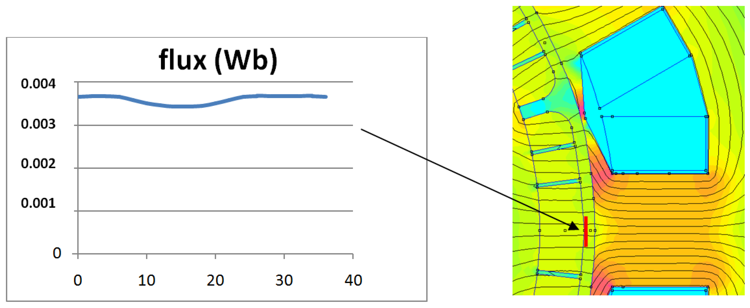 At no load, the rotor position is increasing step by step (0° to 36°). For each position, the flux on one magnet surface is plotted. As the slots were closed, the slot depression mitigates the permeance variation and the flux remains nearly constant.