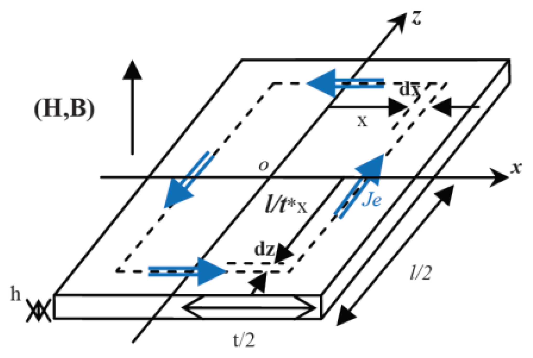 Scheme used for the calculation of eddy currents losses in a conductor sheet in case of neglected skin effect. This means that the thickness of the sheet is small in front of the skin depth.