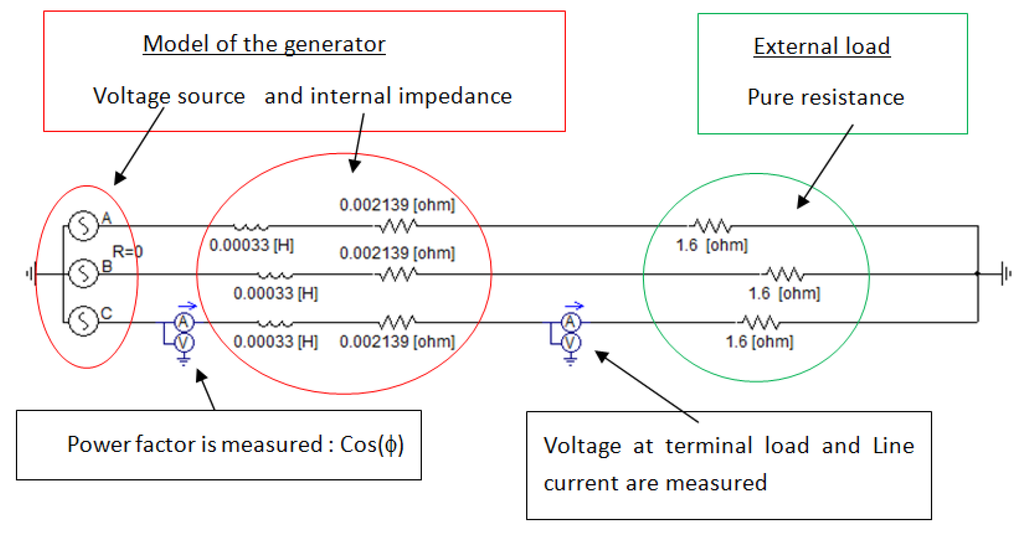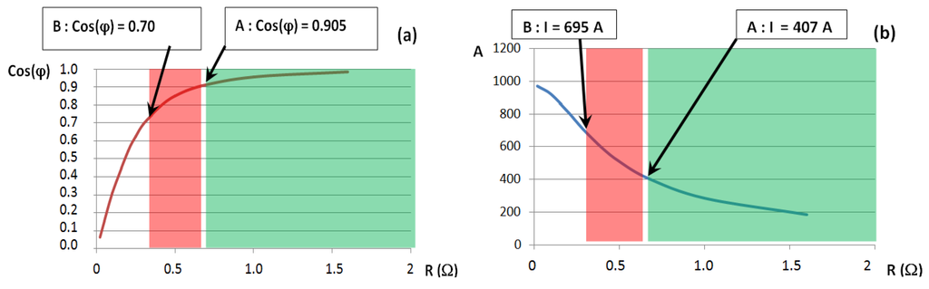 A same fall in performance can be observed in Figure 34, where the power factor seen by the perfect voltage source and the current in lines are plotted. As expected, the power factor is 0.7 (0.7 = cos(45°)) at maximum load, as there is equivalence between the internal reactance and the external resistance. The current in the lines reaches 695 A (+70%) and it could not be possible to maintain 98% of efficiency.