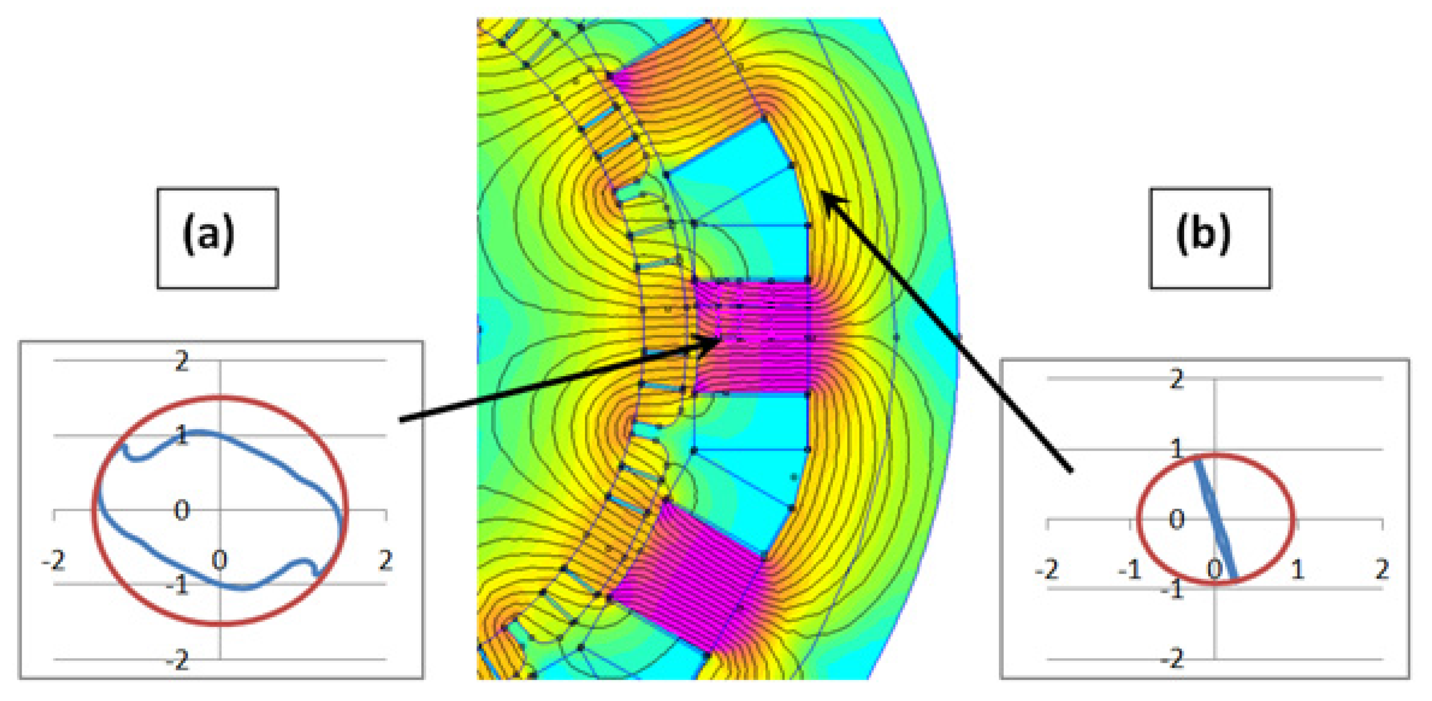 Figure 8b). This phenomenon has a particularity in FSCW as it can appear even if there is no geometrical deviation during manufacturing. Such a structure has situations that give unbalanced magnetic pull, which is not the case with distributed windings.