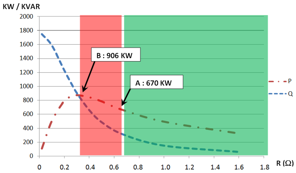 The load associated to the generator is a pure resistance. It evolves from 0 Ω to 1.6 Ω. In this Figure, the power is plotted as a function of the resistance. The reactive power is plotted with the same scheme, this reactive power is the reactive power delivered by the pure voltage source. It takes into account the internal reactance of the machine.