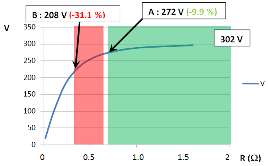 As the internal reactance has more and more importance after the point (A), the voltage drop becomes unacceptable at maximal load (B).