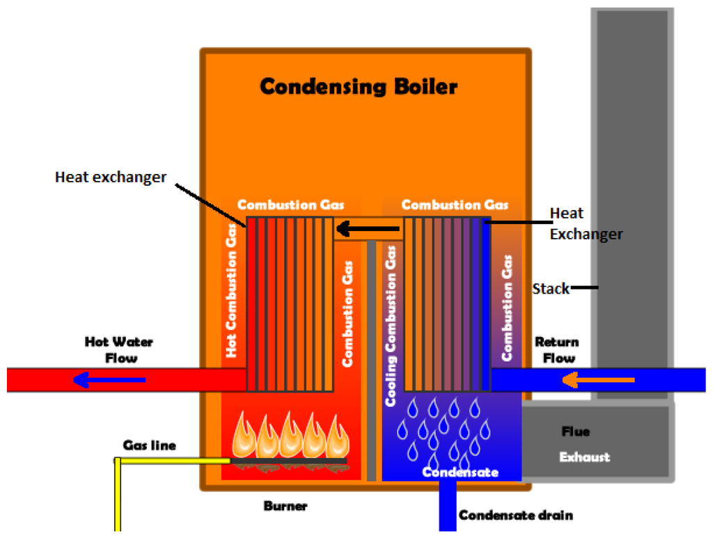 Depending on the cold return water temperature, the condensing boiler operates in two modes, namely: condensing and non condensing modes. Correspondingly, there are two types of heat exchange (dry and wet heat exchange) involved in the heat exchanger which will be explained in the subsequent sections. A condensate drain is installed to collect the condensed water vapor. Hot water produced by a boiler is typically pumped through pipes and delivered to equipment throughout the building, which can include hot water coils in air handling units, service hot water heating equipment, and terminal units [25]. Flue gas exits the boiler through a stack.