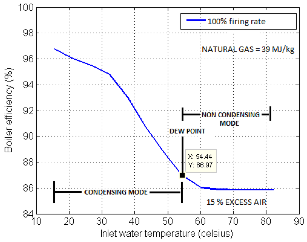 Analyzing the efficiency curve of the proposed model for 100% firing rate in Figure 4, it can be observed that the efficiency curve piece-wise resembles the typical condensing boiler efficiency curve given in literature [25]. Also from Figure 4 it can be seen that when return water temperature is below the dew point of exhaust gas, greater efficiency is achieved as expected for a typical condensing boiler. Above the dew point temperature, the boiler operates in non condensing mode and thus has lower efficiency and below the dew point temperature the boiler operates in condensing mode and consequently has a greater efficiency. Thus, the bimodal behavior of a condensing boiler is also exhibited in Figure 4.