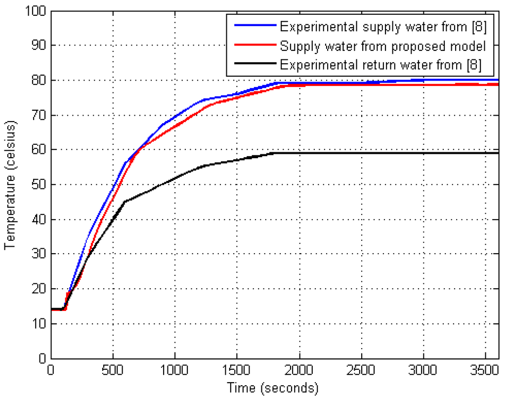 Further, results of the evolution of supply water and the return water (inlet) temperature as a function of time of the dynamic model is shown in Figure 5. To be noted is that the return water temperature used for comparison is obtained from experimental data published in [8,10]. As evident from Figure 5, a close match is obtained between real data and the proposed model.