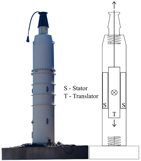 Photo of a prototype wave power generator alongside a simplified section cut showing the position of the stator and translator within the machine. The translator is around 3 long, whereas the whole structure stands just over 7 tall.