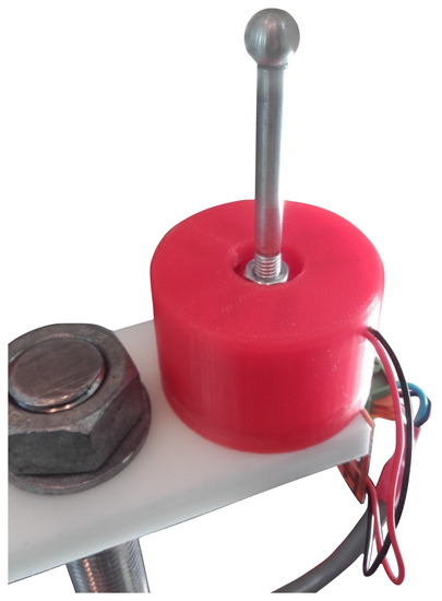 The purpose of a touch probe is to be able to detect contact with any solid object from any direction, relative to the sensor’s tip, except the direction occupied by the probe itself. Numerous commercial touch-probes are available, with accuracies down to less than a few μm, and prices starting at around 500 USD. This level of accuracy was, however, not necessary in this application, as the robot itself had a specified accuracy of ±0.1 . Therefore, a custom probe, shown in Figure 4, was constructed using cheap, easily available electrical components and a 3D-printed plastic chassis. The design of the developed touch-probe is based on the designs presented in the patents US 4547971-A, US 4769919-A and US 4153998-A. The total material cost for the touch probe was approximately 10 USD. This cost is in the same range as the used inductive proximity sensors (OMRON-E2A), costing around 40 USD each.