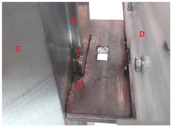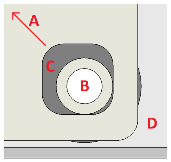An section cut of the squared hole used to allow planar movement of the tool. (A) return spring force direction on the fastening plate; (B) locking bolt and distance piece; (C) low friction pressure distribution washer; (D) main tool surface.