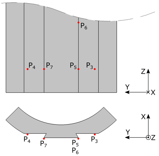 where , , or , , define a plane in 3D-space. Note that the exact indices and the input order of the plane-defining points are different between Equations (1) and (2). Having two separate definitions was a way to handle the problem that the relative orientation between the measured points was different between the pole-shoe and pipe, as will be shown later.