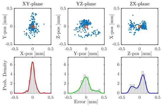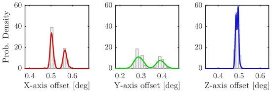The measured tool orientation for this case is shown in Figure 9 and shows that the angular error probability peaks at 2.95 , around the x- and z-axis. The error along the y-axis is negligible in comparison to the other two. The average σ for the orientation offsets was calculated to be 0.011 .
