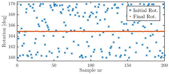 Initial and final rotation of the pipe for 200 calibration cycles for the 165 case. Each cycle was seeded with a random angular error, distributed around the target angle.