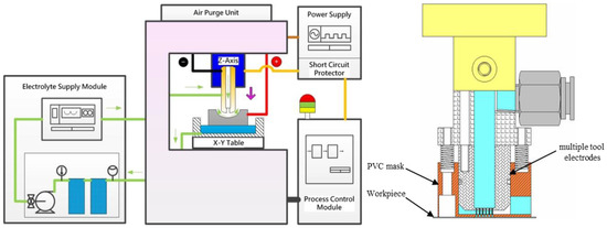 Schematic diagram of electrochemical micromachining system (left) and micro-array hole electrode module (right).