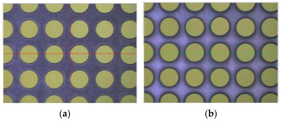 Other basic information and settings are shown as follows: the electrolyte velocity was 10 m/s at the outlet of the pump, the electrolyte temperature was 27 °C, the initial gap between the tool and the workpiece was 100 µm, the tool moving distance was 800 µm, the workpiece material was SUS 304, the electrolyte used was 10% wt. NaNO3, the nominal diameter of the hole was 900 µm, and the depth of the hole was 500 µm. The voltage, pulse-on-time, and feed rate were used as the controllable process parameters, while the inner diameter of the micro-hole Din and the outer diameter Dout were the measurable performances. Figure 2 shows the Charge Coupled Device (CCD) camera image of the array of holes drilled during the μ-ECM experiment.