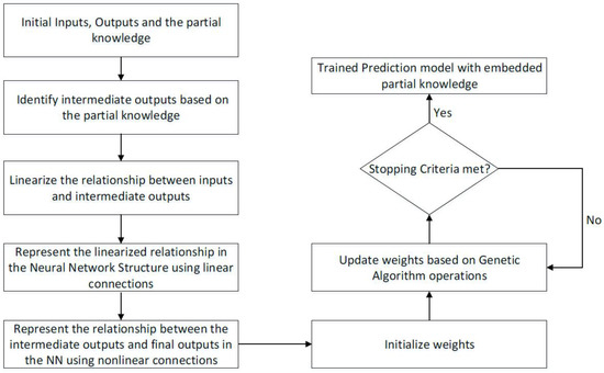 As stated earlier, current work in the literature focuses on mapping directly from the input process parameters to the KPIs. To attempt to increase the prediction accuracy, partial knowledge about the mechanisms of μ-ECM was embedded in the NN. This was accomplished by finding some intermediate outputs that are influenced by the inputs and are closely related to the outputs. The relationship between the inputs and intermediate outputs has been studied by researchers [11,12,13]. To embed this knowledge in the NN, the relationship between the inputs and the intermediate outputs was first linearized. This linearized relationship was represented in the NN as linear weighted connections between the inputs and the first hidden layer, where the outputs from the first hidden layer represent intermediate outputs. Additional hidden layers were then added to the NN, which connected the first hidden layer and the output layer where the connections were nonlinear. Once the NN structure with the embedded partial physical knowledge was established, the weights of the NN could be trained using any gradient-based or metaheuristic algorithm. The flowchart of the proposed idea is shown in Figure 3.