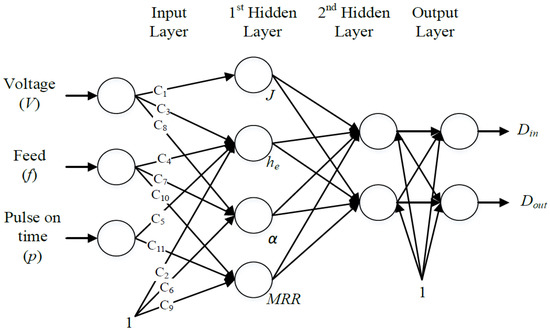 Senthilkumaar et al. [2] created a forward prediction model between the input process parameters and KPIs of turning and facing of the Inconel 718 by utilizing a combination of mathematical models and neural networks (NN). Chen et al. [3] used a back-propagation NN (BPNN) to create a forward prediction model between the input process parameters and KPIs of plastic injection molding. Maji and Pratihar [4] created forward and backward input-output models between the process parameters and KPIs of EDM by combining an adaptive neuro-fuzzy inference system (ANFIS) and the genetic algorithm (GA), i.e., the GA was used to optimize the membership functions of the ANFIS. Fard et al. [5] used the ANFIS for mapping between the input parameters and KPIs of dry wire electrical discharge machining (WEDM). Teimouri and Baseri [6] used a combination of the artificial bee colony (ABC) algorithm and fuzzy logic (FL) to create a forward prediction map from the input process parameters to the KPIs of friction stir welding (FSW). Rajora et al. [7] used a generalized regression neural network (GRNN) to map from the input process parameters to the KPIs of μ-ECM. Lu et al. [8] used a NN for predicting the surface roughness in the micro-milling of the Inconel 718. Panda et al. [9] used an Artifical Neural Network in combination with the Finite Element Analysis model to predict the material removal rate and average surface roughness in a die-sinking electrochemical spark machining process. Zou et al. [10] developed an intelligent prediction model based on a NN to predict the outputs for the process of μ-ECM.