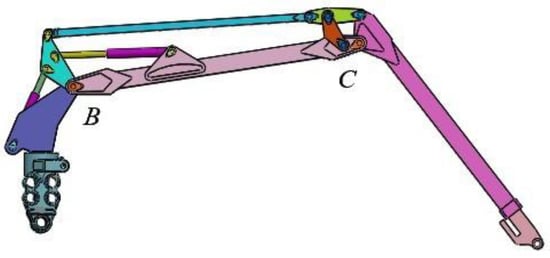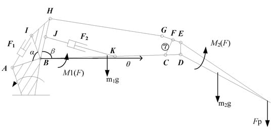 The main cylinder is the boom’s lifting power in order to provide enough hoisting force [17]. The force does not act directly on the jib, but is transmitted to the jib through intermediates such as the pusher and link, and is then transmitted to the harvesting head at the end of the telescopic arm. The axial force F of the main hydraulic cylinder is calculated on its piston area.