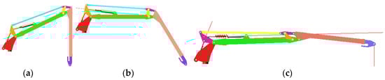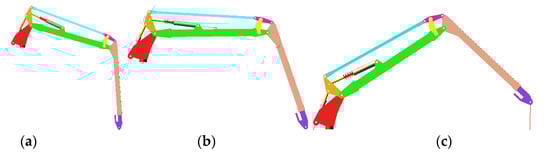 In simulating the motion of the second cylinder, the main cylinder and telescopic boom movement are determined first, and only the second cylinder can be telescopic. The expansion of the second cylinder drives the jib and the embedded telescopic boom rotating around the hinge point C (the hinge point of the main boom and secondary boom). The working range of the boom and its weight are only affected by the secondary cylinder. The master cylinder is set in different states, the boom is set to different initial working states, and the main cylinder and telescopic cylinder are locked. Next, the simulation drive parameters of the secondary cylinder are set, and the simulation time is set to 10 s. The three conditions show the selection of the first luffing angle as −20°, 0°, and 45° in Figure 4.