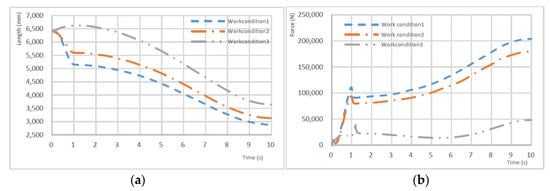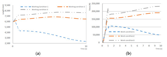 Figure 5 shows that the maximum operating amplitudes of work condition 1, work condition 2, and work condition 3 are 4.8 m, 6.9 m, and 8.2 m. The figure shows the “length” for the end of the main cylinder trajectory, indicating the displacement of the bottom of the auxiliary arm. Figure 5a shows that the motion and work of conditions 1, 2, and 3 are different. This is because the main arm of the working arm is upward sloping as a result of the decision to set the initial position as working condition 1; when the master cylinder is retracted, the main arm to rotate on the side arm will rotate inwards, and the jib low end displacement decreases gradually. The change rules of work condition 2 and work condition 3 are similar. It is obvious that the reachable range of the three working conditions are increasing, as the working position of the telescopic arm controlled by the secondary cylinder is different. According to the load spectrum, the maximum load of working condition 1 can reach 3120 kg, while the maximum load of working condition 2 is 1910 kg, and the maximum lifting capacity of working condition 3 is 1230 kg.