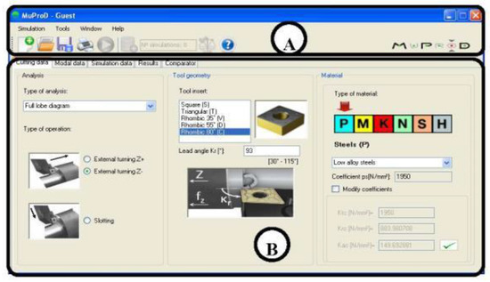 This section shows how the utility addresses diverse machining problems, from the input data to the final graphs that will help the user in decision making. Figure 1 shows the typical interface. Thus, on the top side of screen (A), the toolbar menu presents access to program options such as Simulation, Tools, or Help, as well as to different shortcuts for fast actions. On the lower side (B), the user must fill in the input data to get access to the following tabs. As seen, the system operator is only asked for data in a technical-native language and is always focused on the machining operation, solving a typical drawback of several machining simulation softwares mentioned above, in which a lot of previous knowledge about the fundamentals and basis of equations dominating the process is needed; in general, this was a common drawback that had, and still has, set back the spread of approaches by 20 years, similar to that presented here. The main interface uses codes, pictures, and options related to machining that are used by all machining users. All machining parameters are involved in the initial windows and forms.