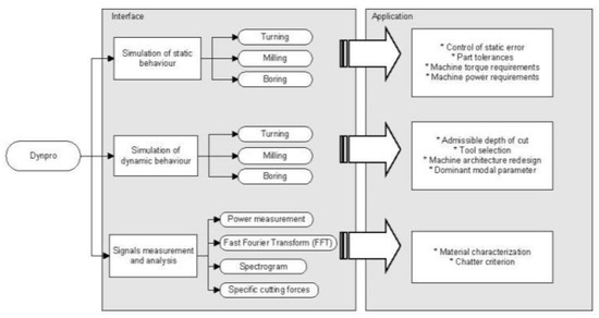 From the CAM stage to the finished product stage, the need of integration over the different production steps is a key issue to maintain market demands. For this reason, the authors developed innovative software, named Dynpro®, which integrates the models developed during the last few years concerning static and dynamic behaviour (Section 4) of the turning, boring, and milling processes. The development tool Visual Studio was selected for the program code, due to its multi-step nature. Additionally, MATLAB was used to create other different modules in which numerical calculations are required.