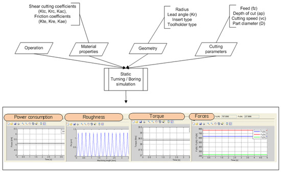 The toolbox “Simulation of static behaviour” is based on the mechanistic cutting force model developed in Section 4.1, which assumes a proportionality law between the forces and the removed chip section. From this relation, the software predicts the three force Cartesian components for a wide combination of operations, tool geometries, part materials, and cutting parameters (Figure 3). The module is completed with additional tabs for the calculation of the roughness, power, and torque consumption in stable conditions (without vibrations).
