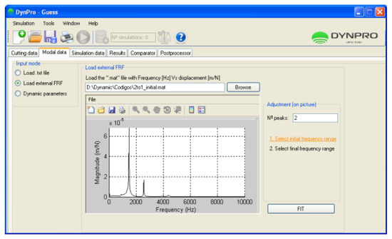 In the simulation of the dynamic module, the user must introduce the process kinematics, tool geometry, and material properties in the first tab. Then, the modal parameters of the machine and tool couple are loaded (from the database) or are asked from the user as well. Dynamic parameters are obtained by impact tests using an instrumented hammer and a vibration analyzer, through the calculation of the dynamic response function (DRF). Accordingly, Dynpro® includes an innovative toolbox to filter and fit the frequency response function (FRF) archives to the modal parameters, which are easily recognized and used by the program. These are then directly set by the keyboard in the Modal parameters tab. Otherwise, a *.txt archive with equivalent information can be loaded. Once the modal parameters are loaded, a final tab with the simulation parameters must be filled.