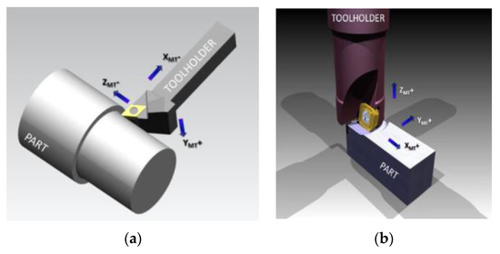 Orientation of a modal vector: (a) Turning operation; (b) Milling operation.