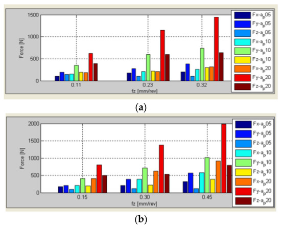 Cutting forces from Dynpro® for two turning inserts: (a) Rhombic 35° (VBMT); (b) Square 45° (SNMG).