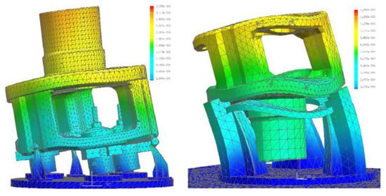 Hence, Figure 9 shows the deformation of the part-fixture-table assembly under radial forces for two different clampings of the same part, using FEM. The meshing was finer in those areas in which more resolution was demanded. Therefore, after the virtual testing of the proposed designs, it was possible to define the best clamping system.
