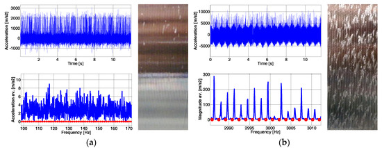 The cutting signals were then post-processed with the software to identify the sources of vibration. Dynpro® allows for converting the signals to the FFT spectrum (magnitude vs. frequency) or to the spectrogram (frequency vs. time). It was observed that the machine exhibited (see Figure 13) high frequency vibration (near 3026 Hz). This was confirmed also by the wavelength of the surface marks. Figure 14a,b show the frequency signals with respect to time, the frequency spectra (FFT), and the final surface finish for the two cases, stable and chatter. The first one leads to a distributed FFT signal in the frequency range with low amplitude peaks while the second one presents a dominant peak near the natural frequency and a phase lag periodic peak pattern with respect to the cutting frequency of the cutting and its multiples (circles in red of Figure 14b).