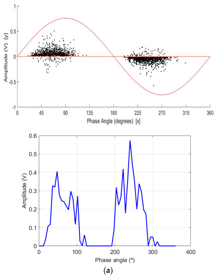Initially, the PD data is captured as PRPD patterns showing the PD magnitude (in V) and the corresponding phase angle. The PRPD plot is cumulatively acquired by continuously capturing data over a number of power cycles. This comprises the PD amplitude (in V) at different phase angles of the half power cycle. Based on this, the PRPD is then processed into a different plot showing the maximum amplitude versus phase angle that will serve as the input for training and testing the developed EBA.